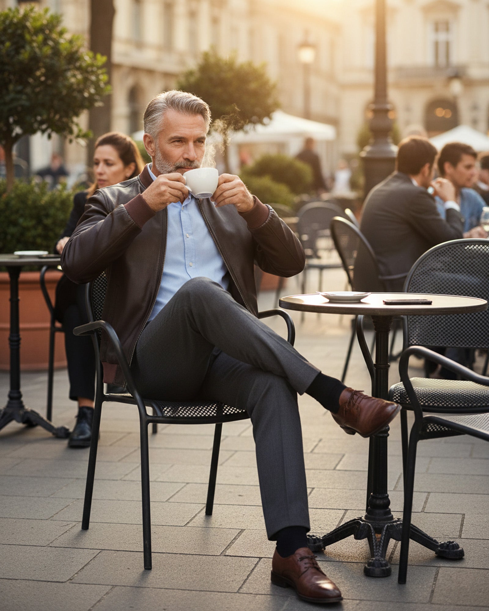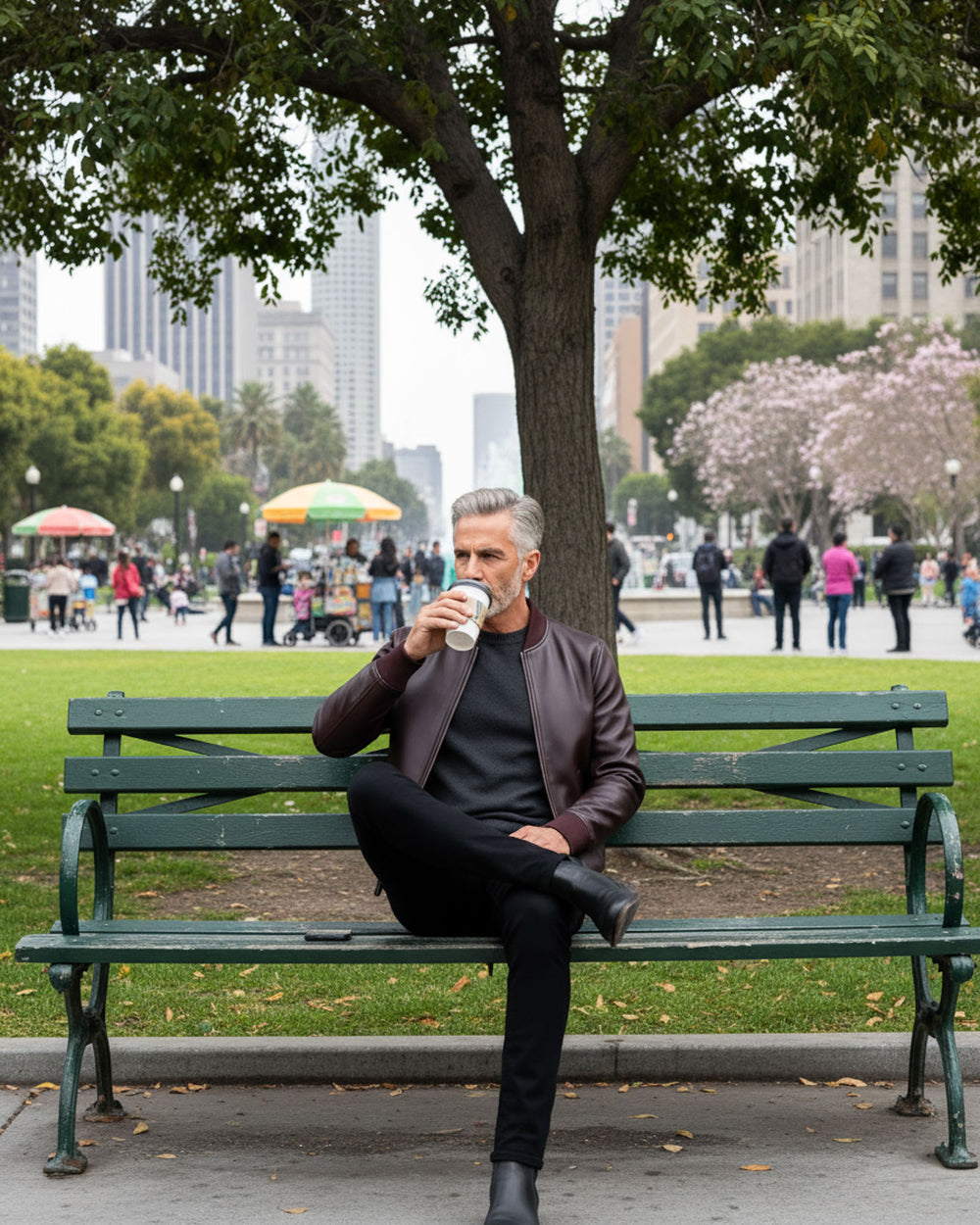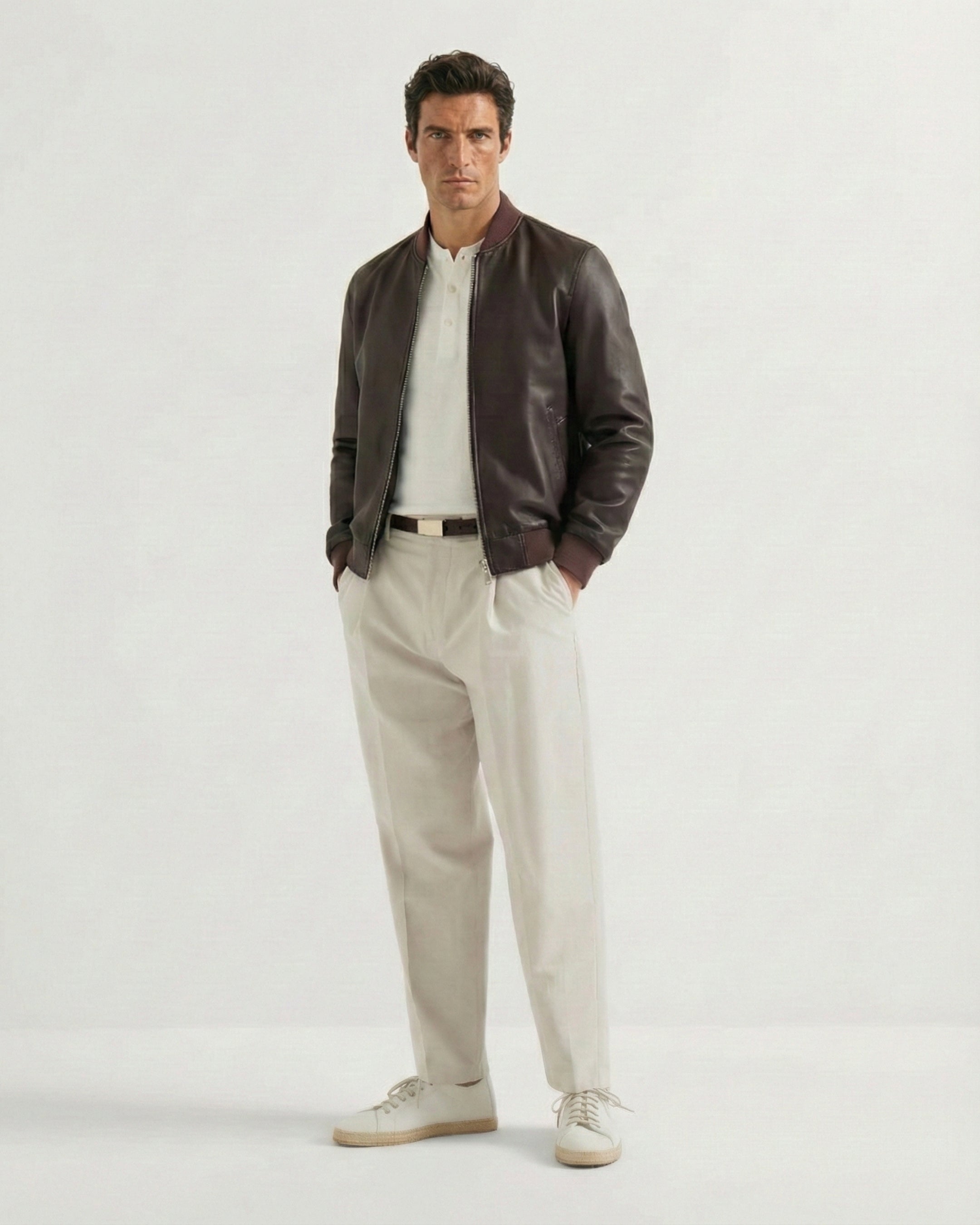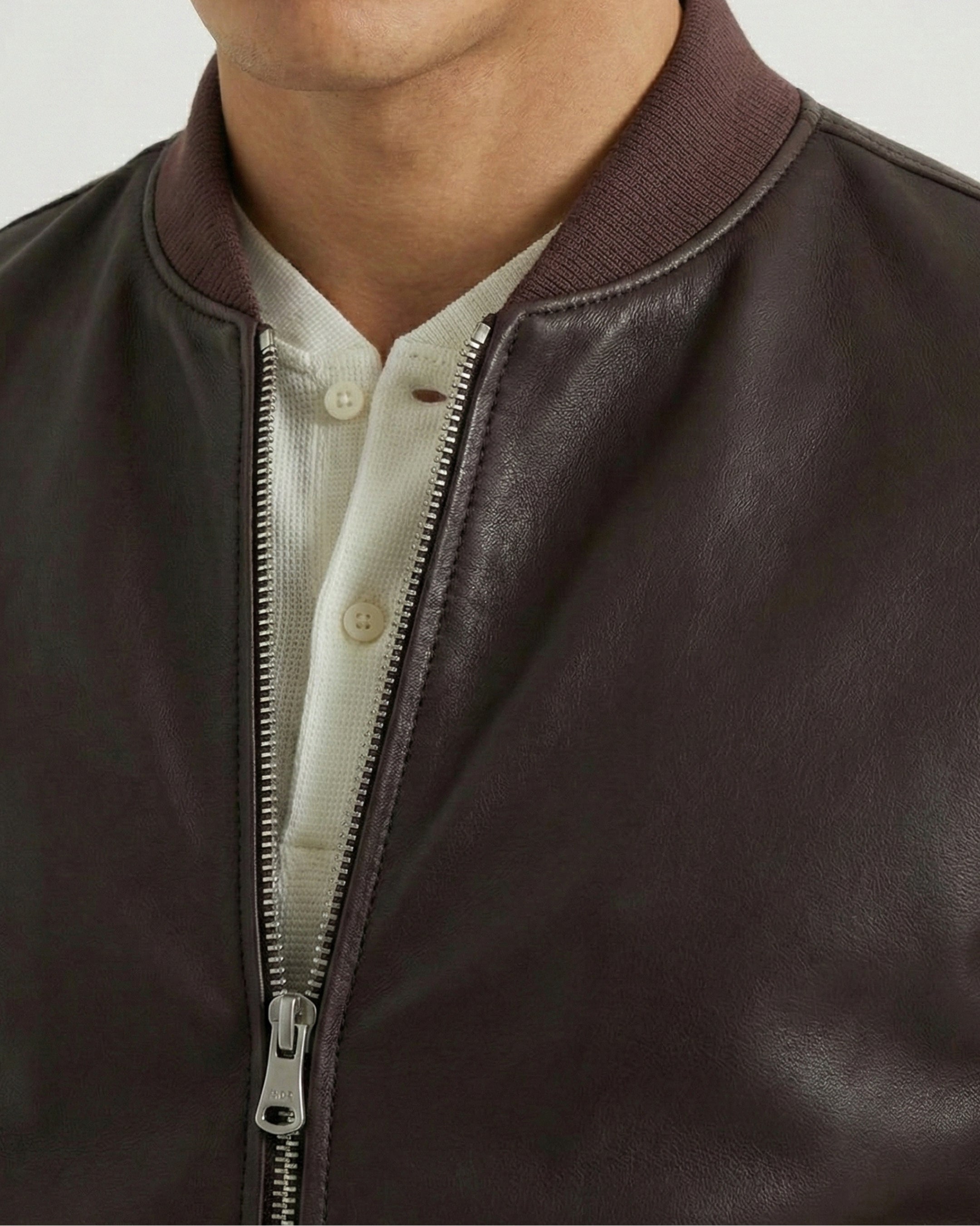 A leather jacket should sit clean on the shoulders, hug the chest lightly, and allow comfortable movement. Sleeves should reach the wrist bone. If you plan to layer a knit, consider one size up.