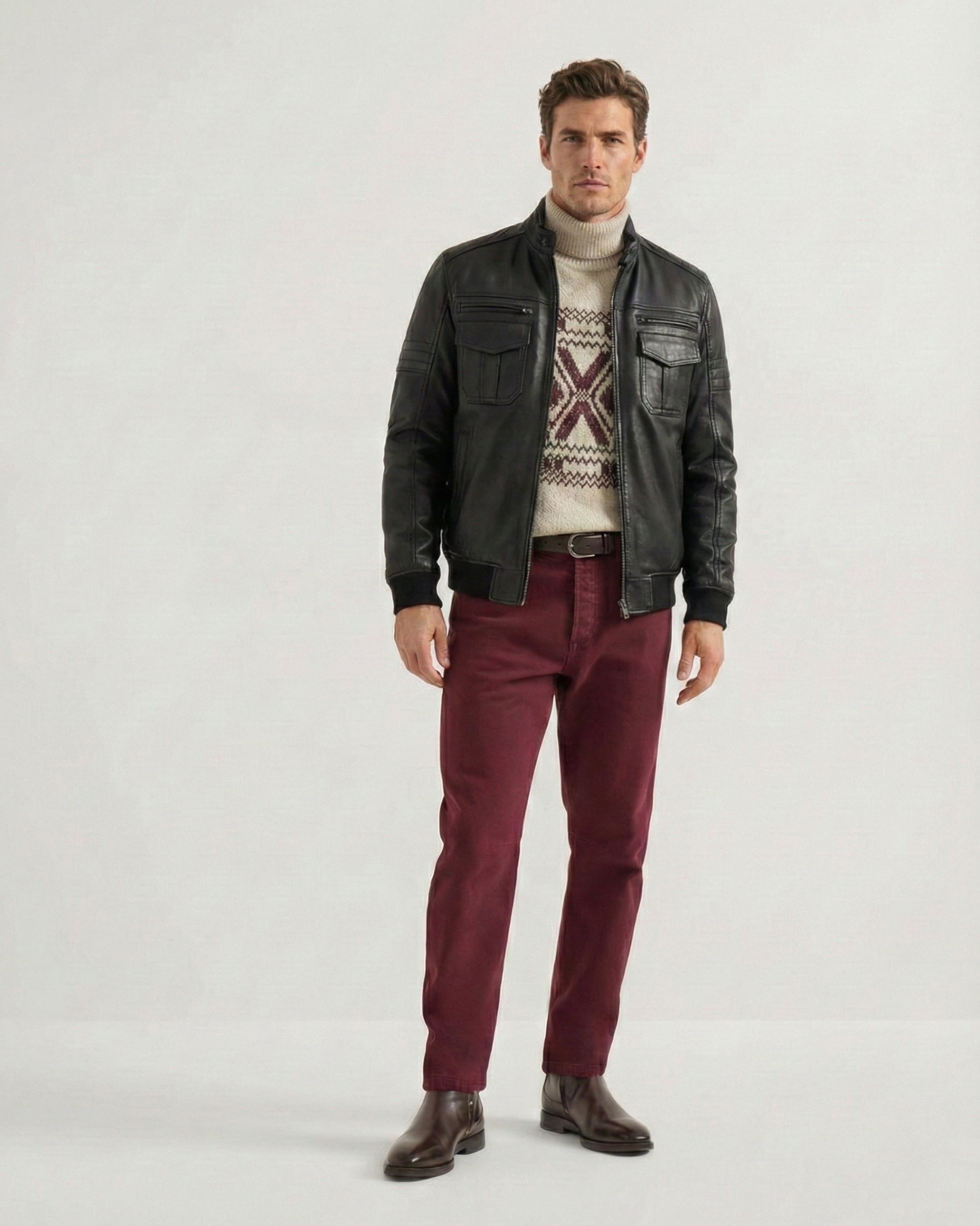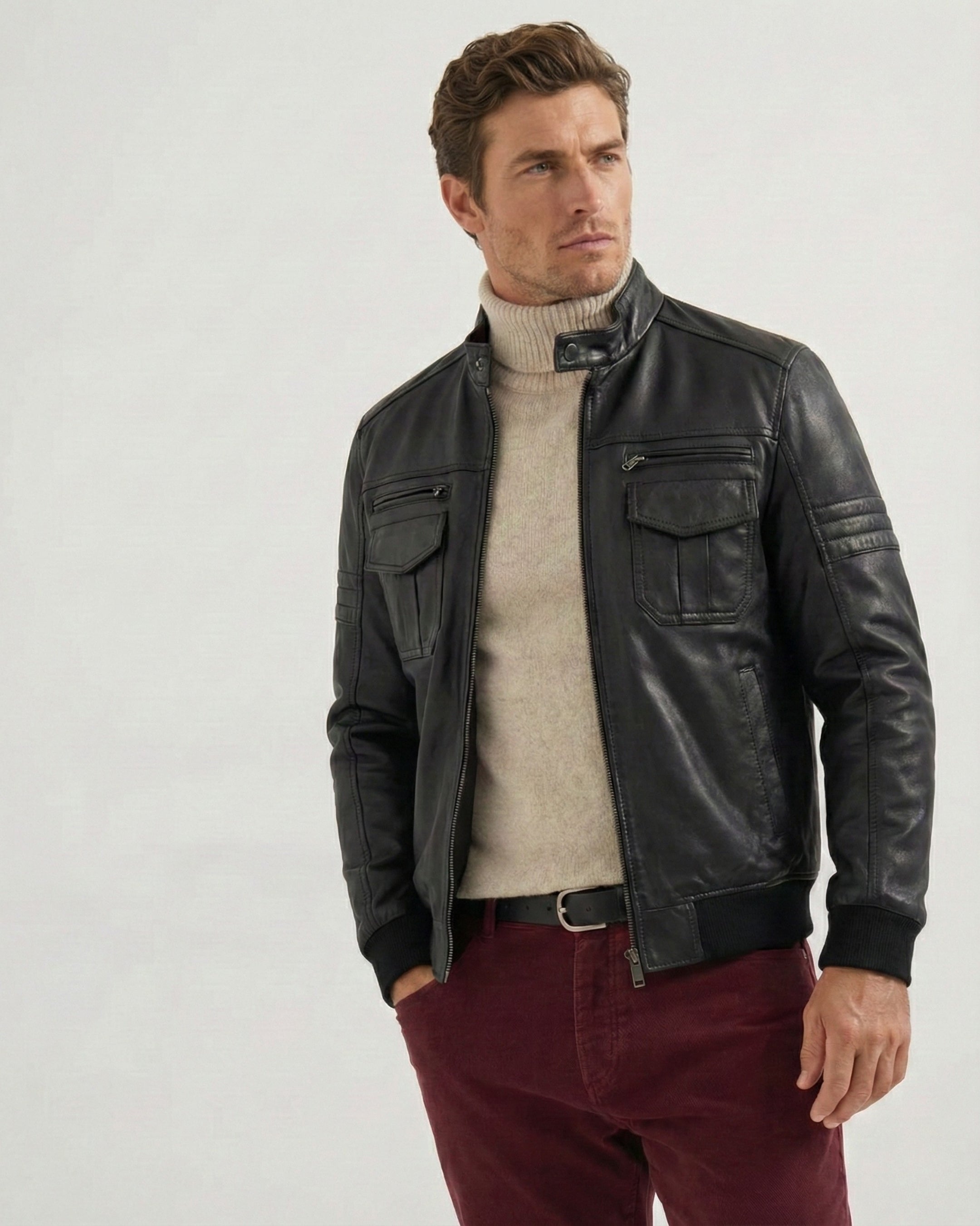 A leather jacket should sit clean on the shoulders, hug the chest lightly, and allow comfortable movement. Sleeves should reach the wrist bone. If you plan to layer a knit, consider one size up.
