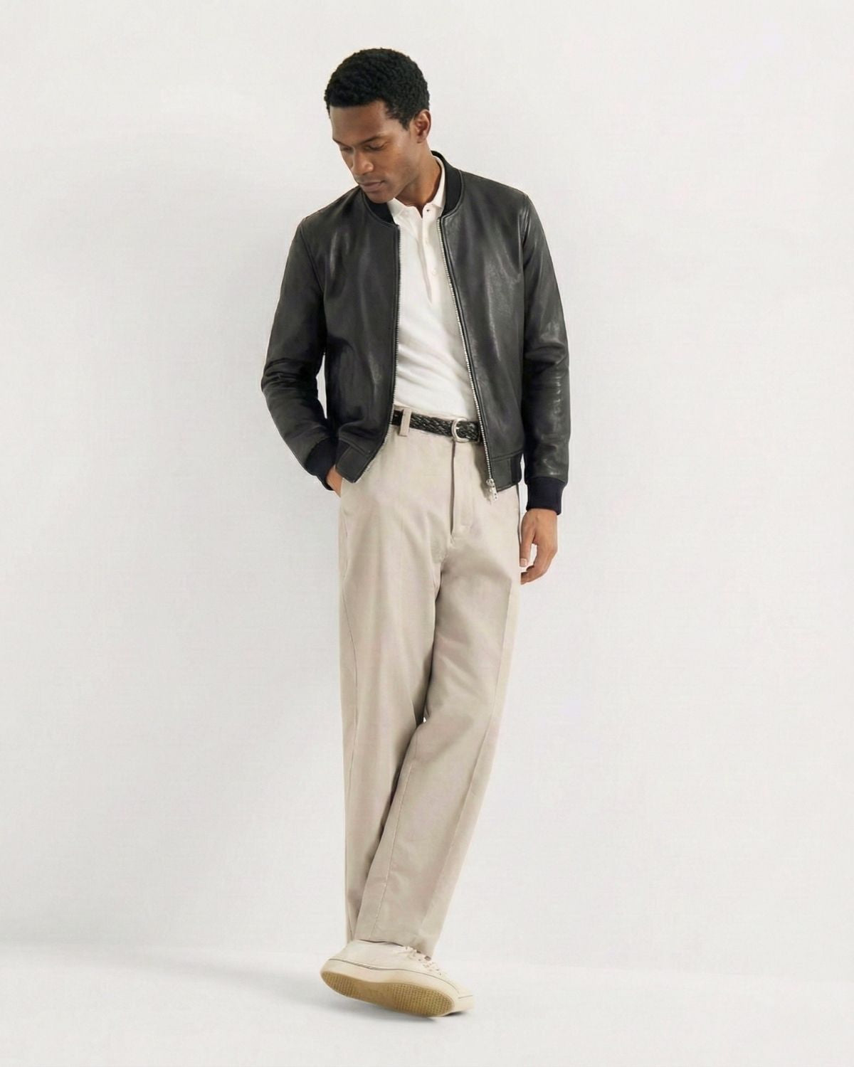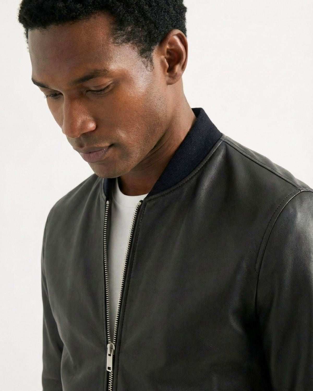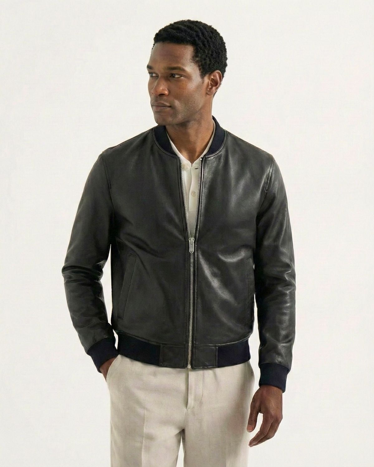 A leather jacket should sit clean on the shoulders, hug the chest lightly, and allow comfortable movement. Sleeves should reach the wrist bone. If you plan to layer a knit, consider one size up.