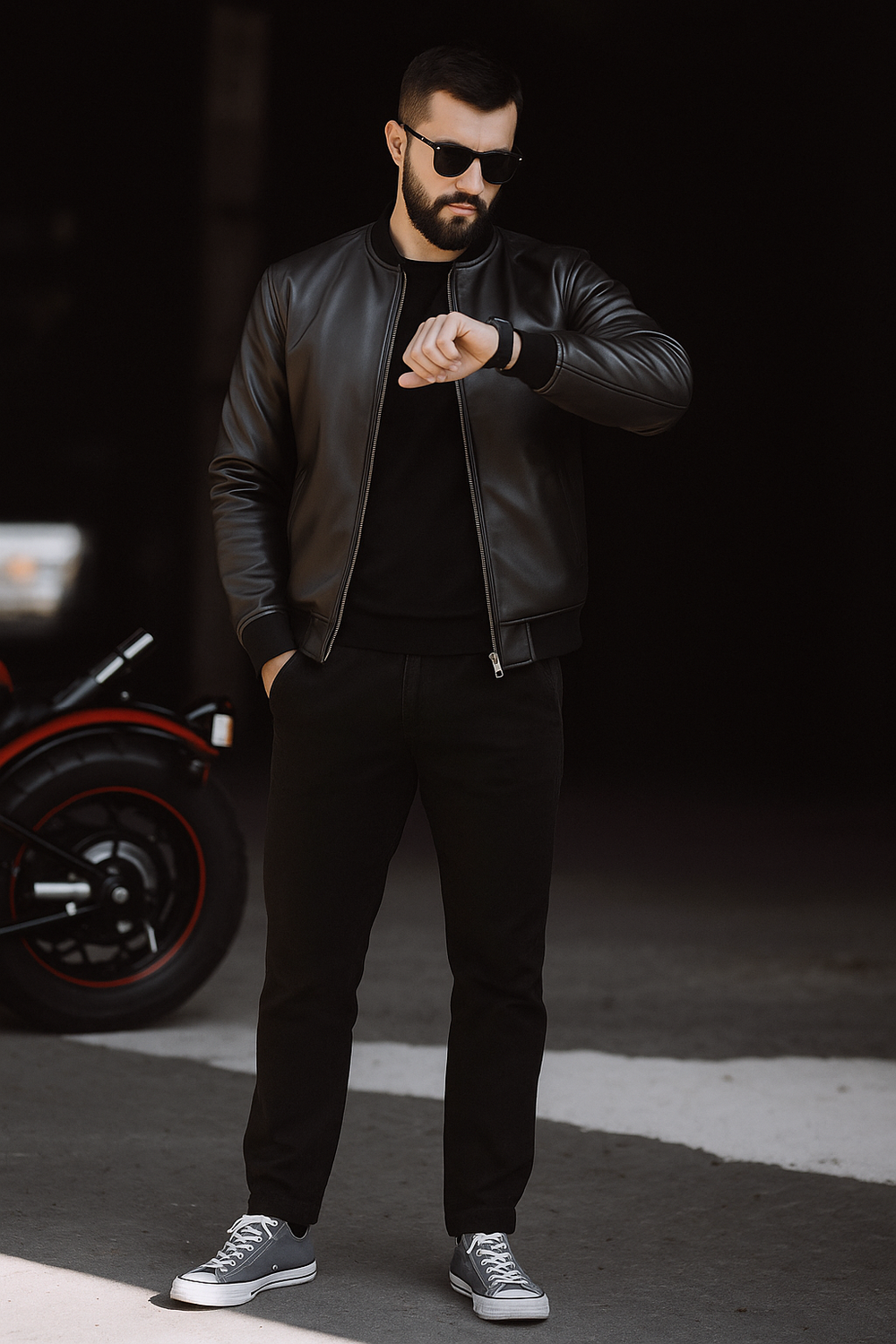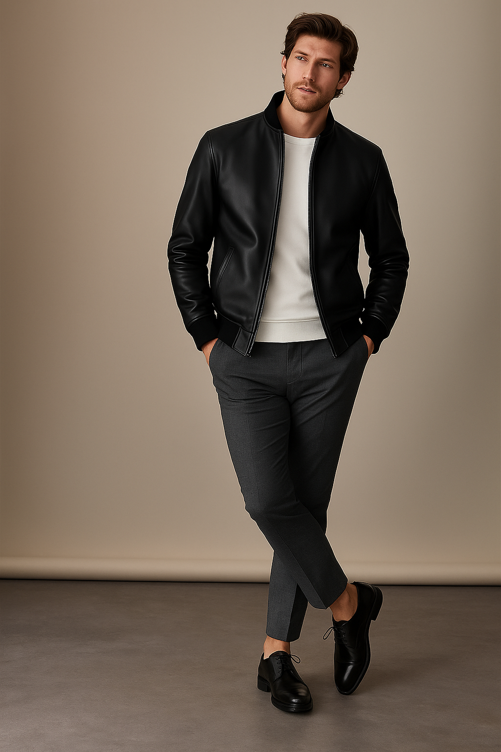 A leather jacket should sit clean on the shoulders, hug the chest lightly, and allow comfortable movement. Sleeves should reach the wrist bone. If you plan to layer a knit, consider one size up.