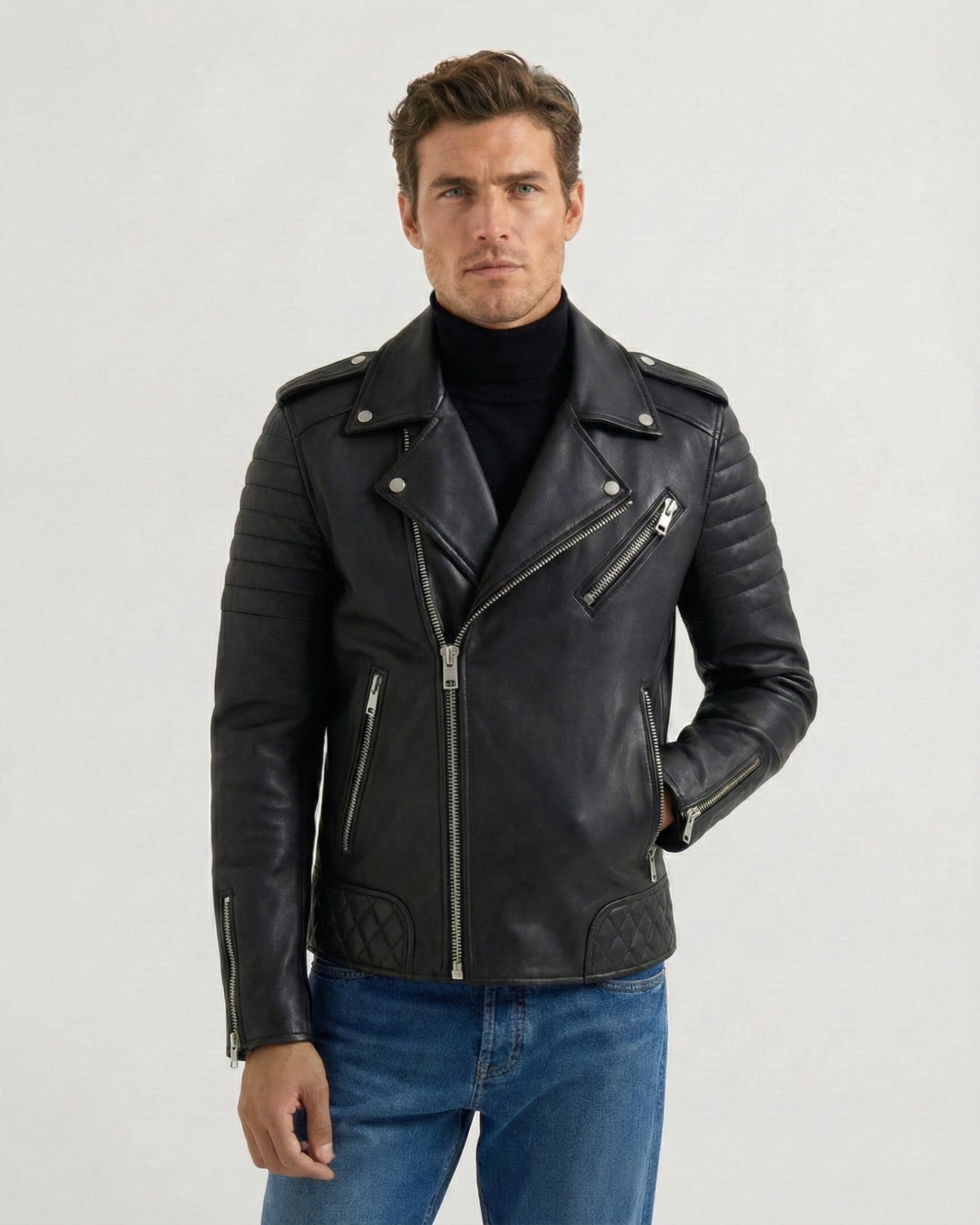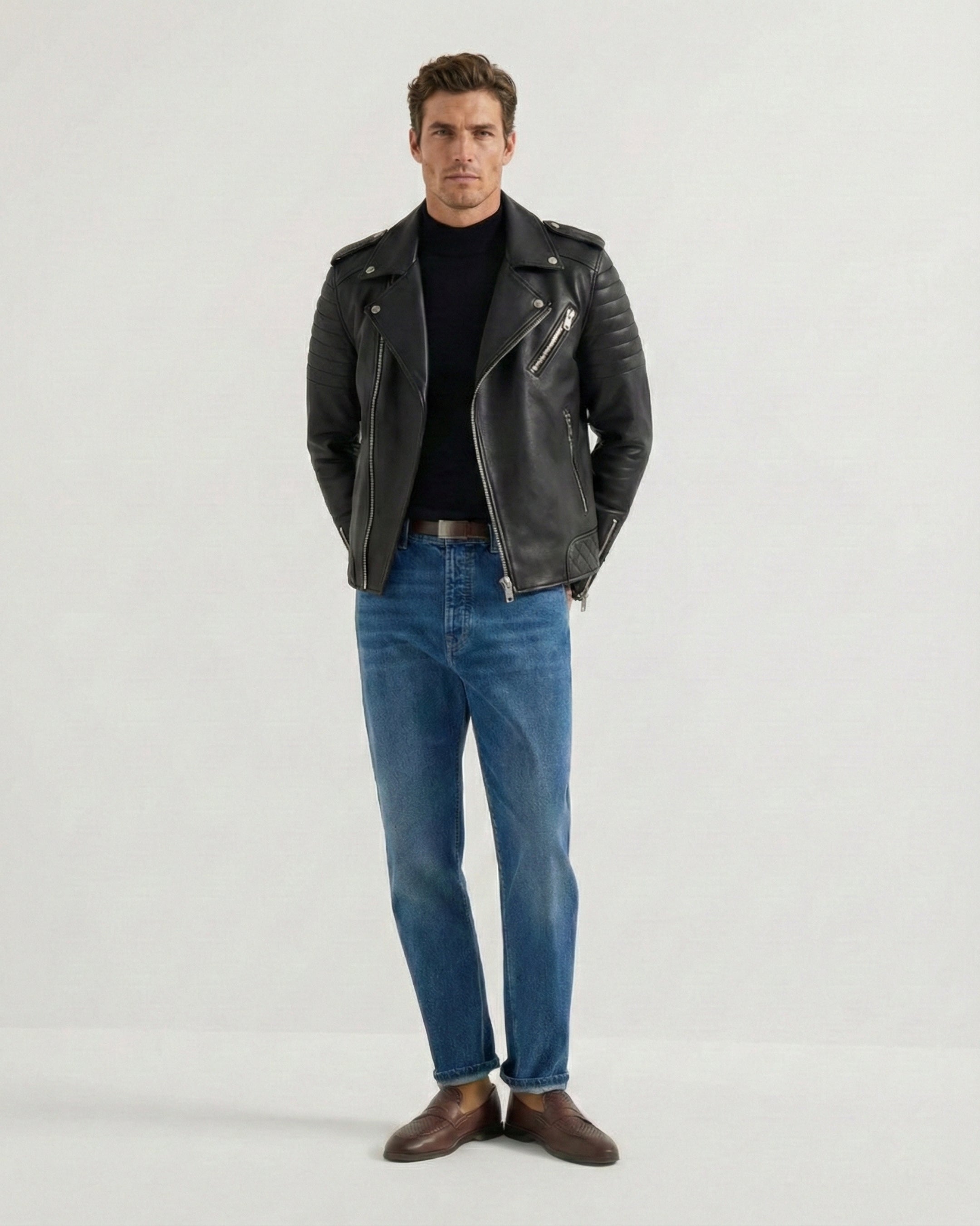 A leather jacket should sit clean on the shoulders, hug the chest lightly, and allow comfortable movement. Sleeves should reach the wrist bone. If you plan to layer a knit, consider one size up.