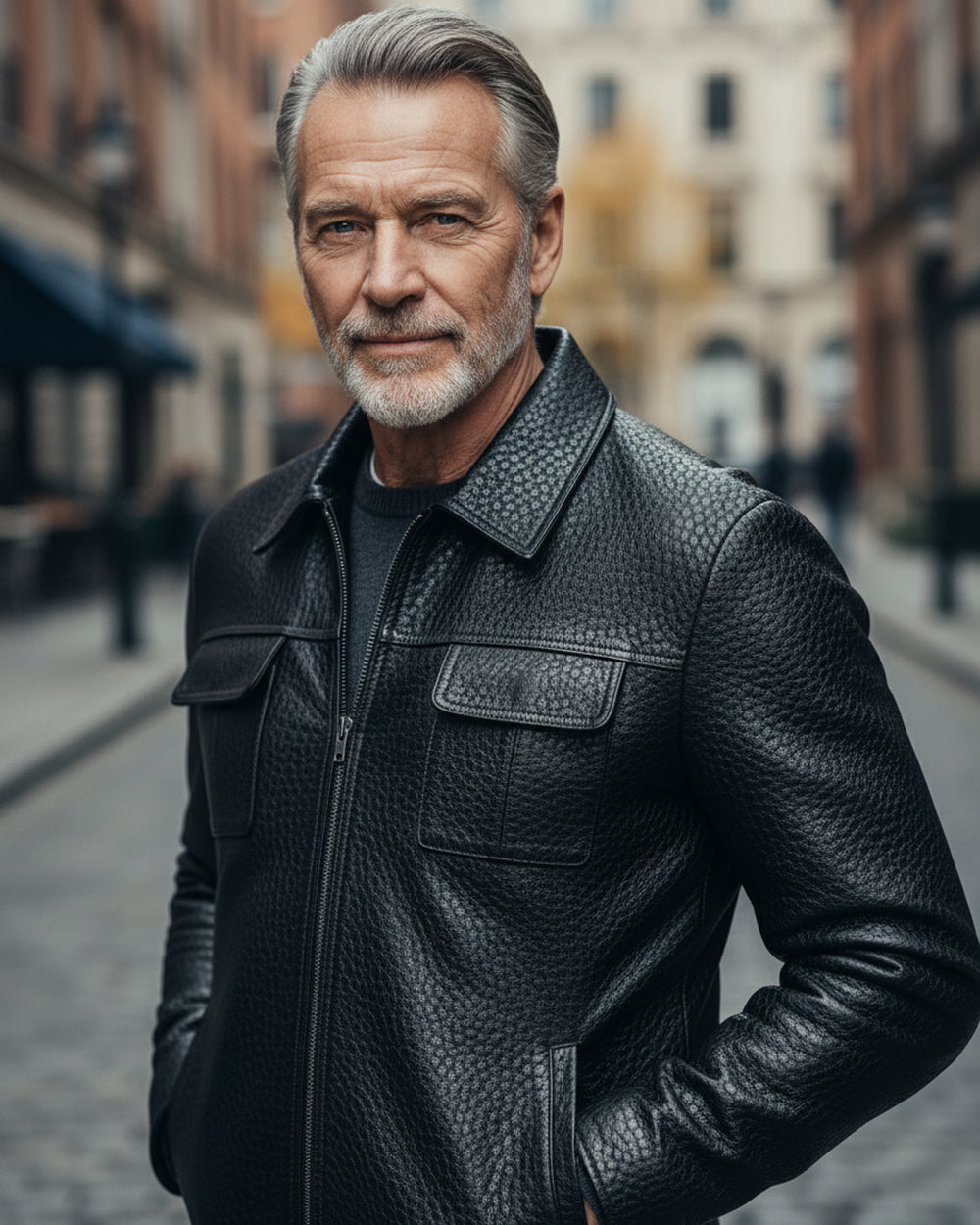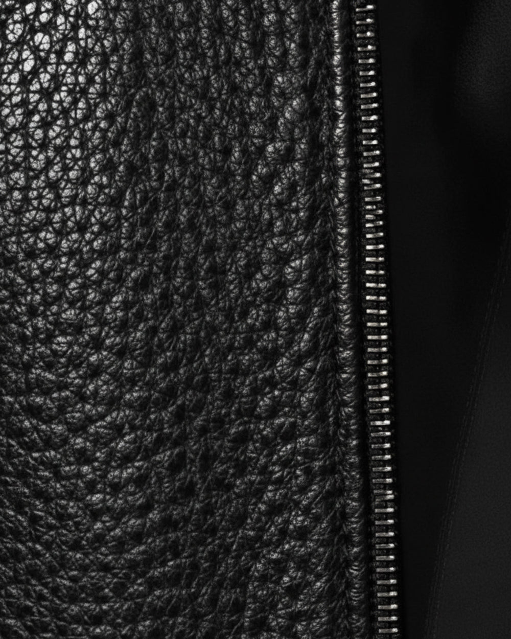 A leather jacket should sit clean on the shoulders, hug the chest lightly, and allow comfortable movement. Sleeves should reach the wrist bone. If you plan to layer a knit, consider one size up.