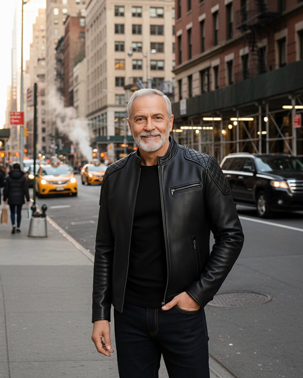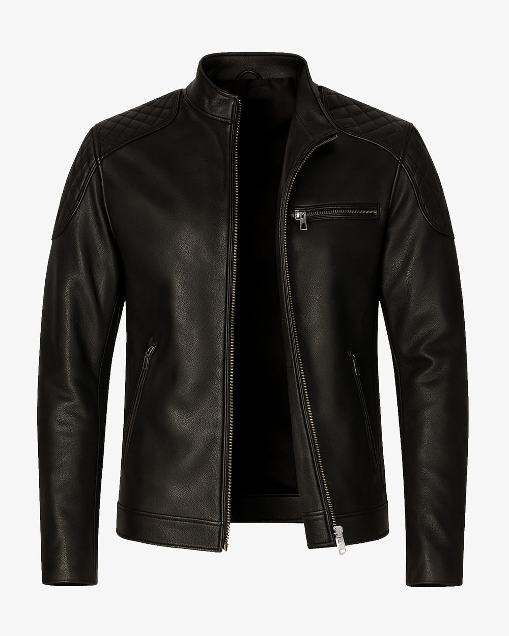 A leather jacket should sit clean on the shoulders, hug the chest lightly, and allow comfortable movement. Sleeves should reach the wrist bone. If you plan to layer a knit, consider one size up.