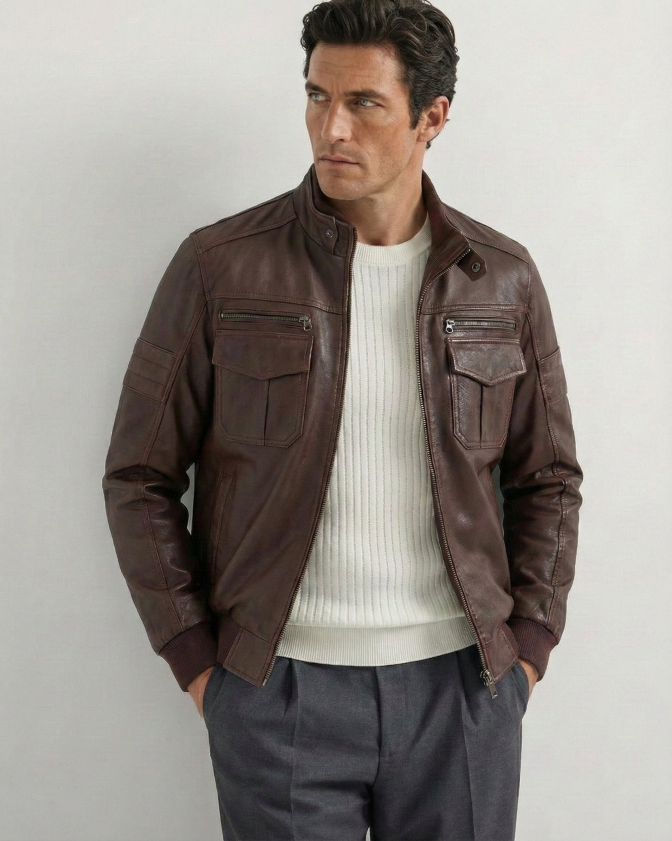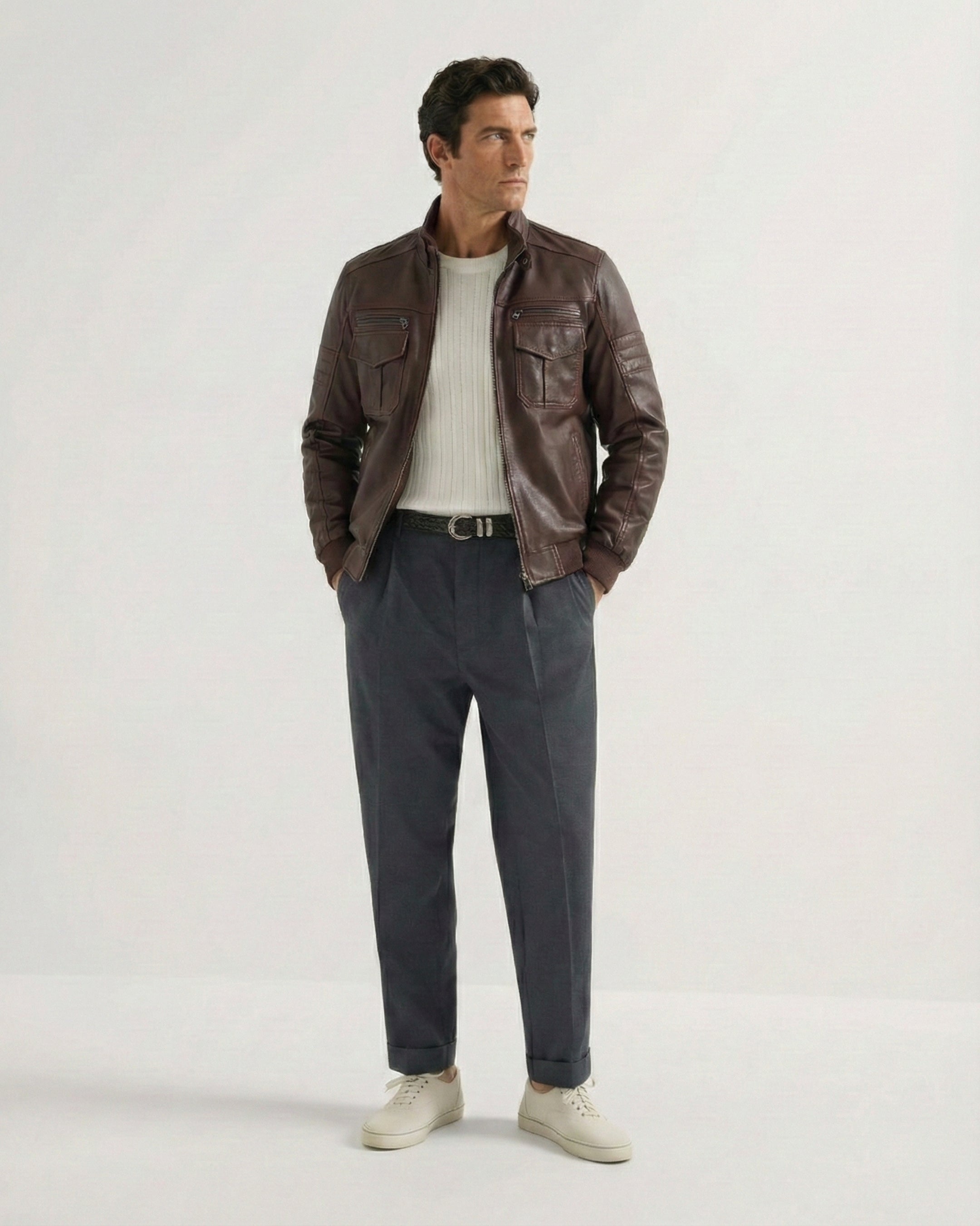 A leather jacket should sit clean on the shoulders, hug the chest lightly, and allow comfortable movement. Sleeves should reach the wrist bone. If you plan to layer a knit, consider one size up.