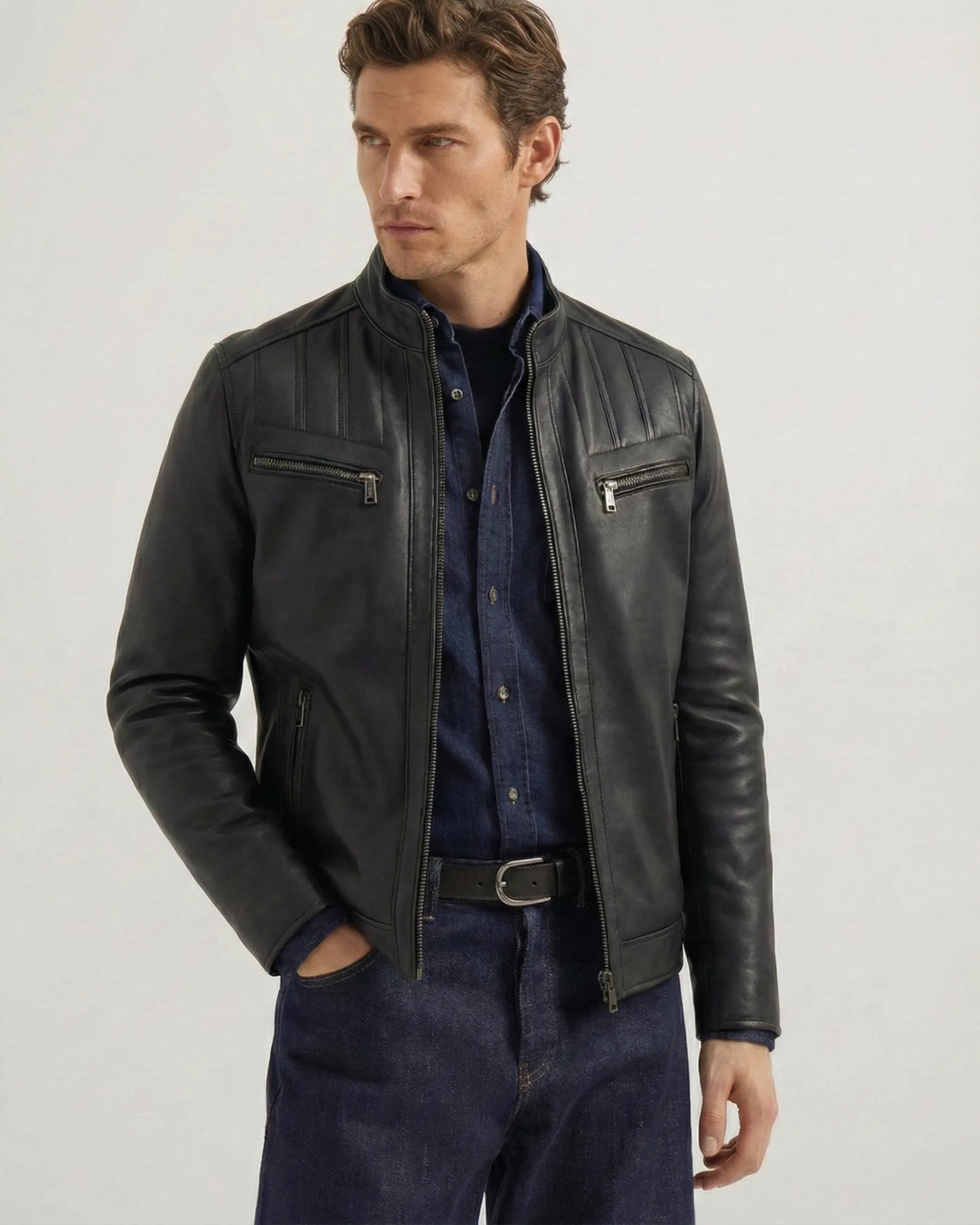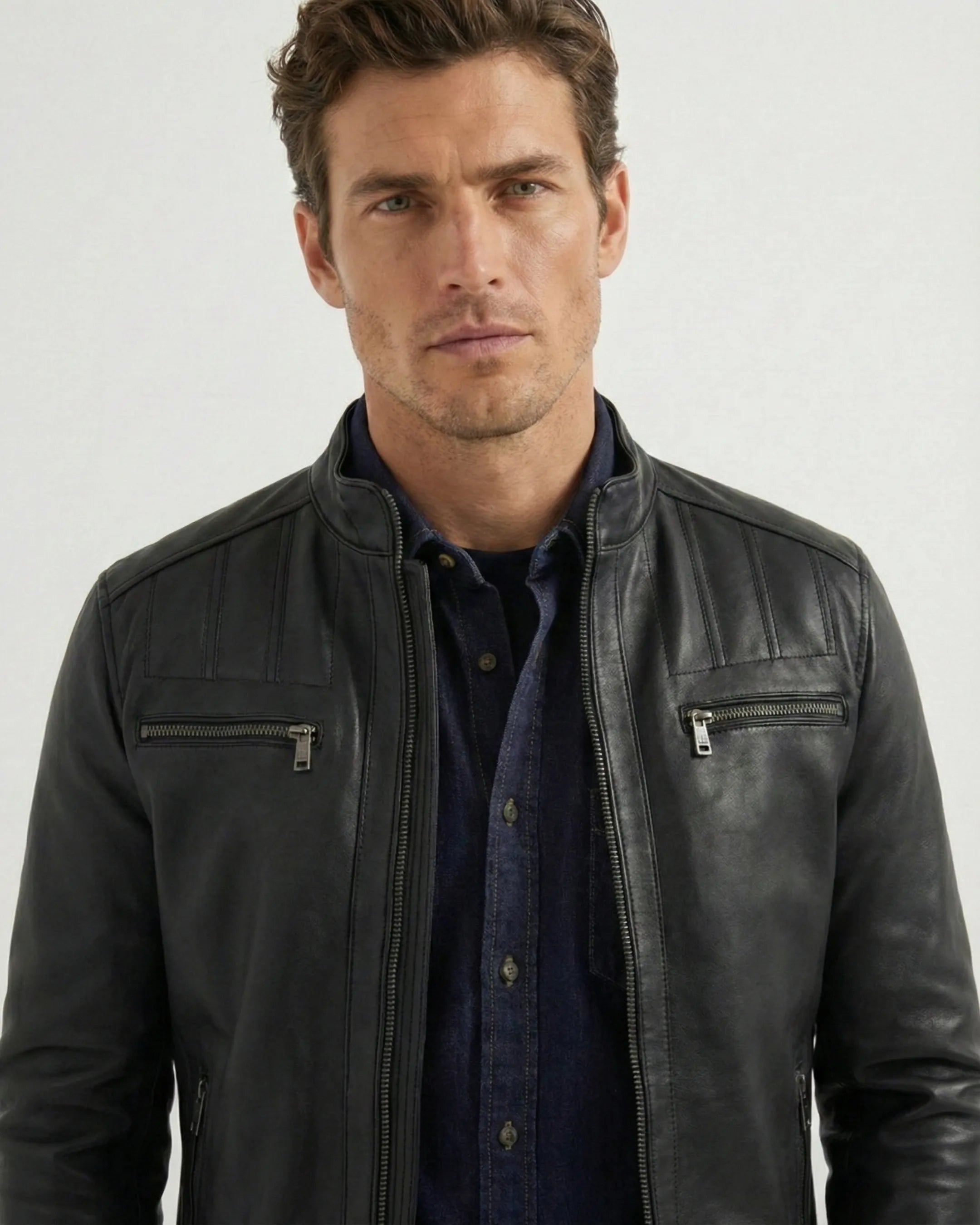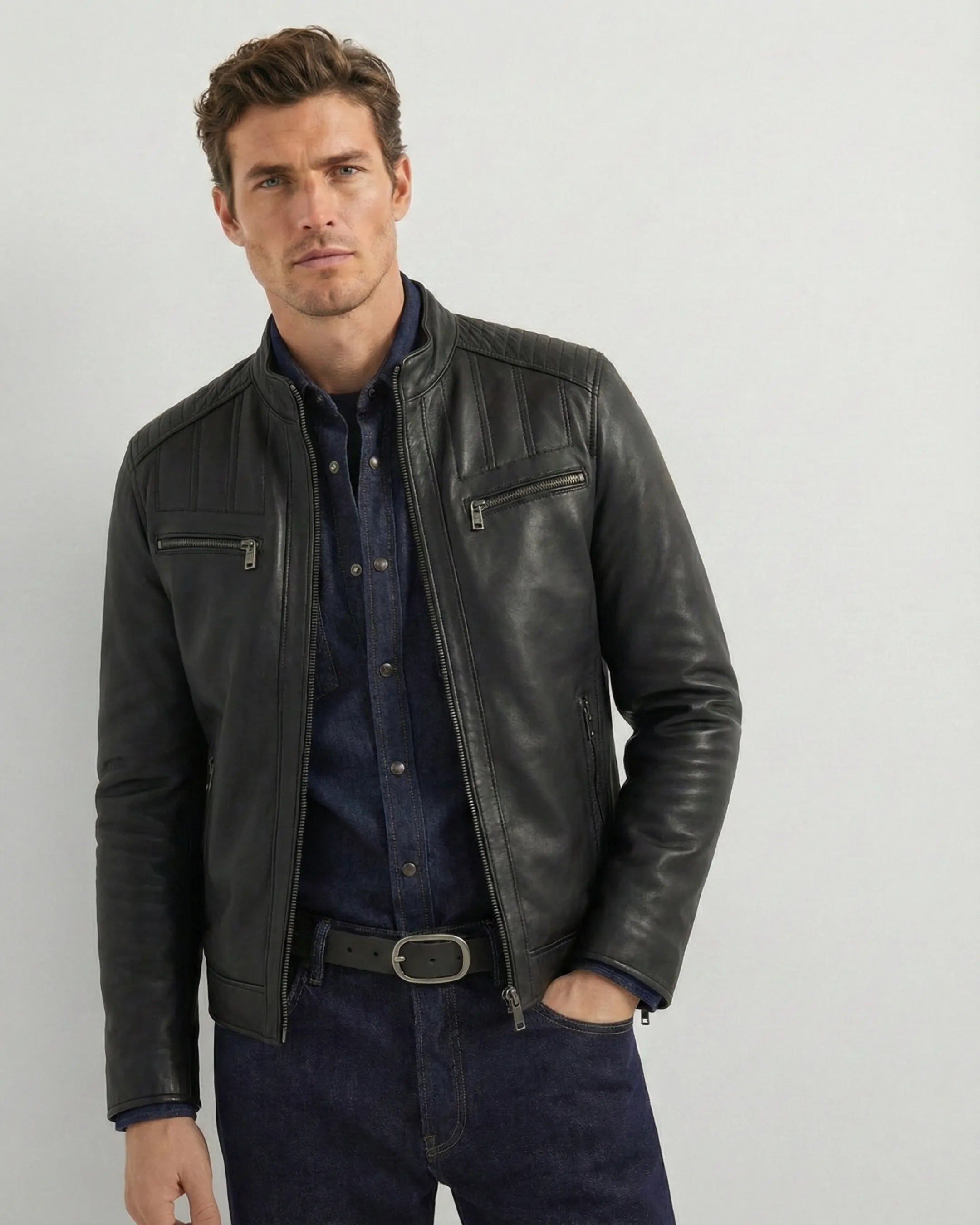 A leather jacket should sit clean on the shoulders, hug the chest lightly, and allow comfortable movement. Sleeves should reach the wrist bone. If you plan to layer a knit, consider one size up.