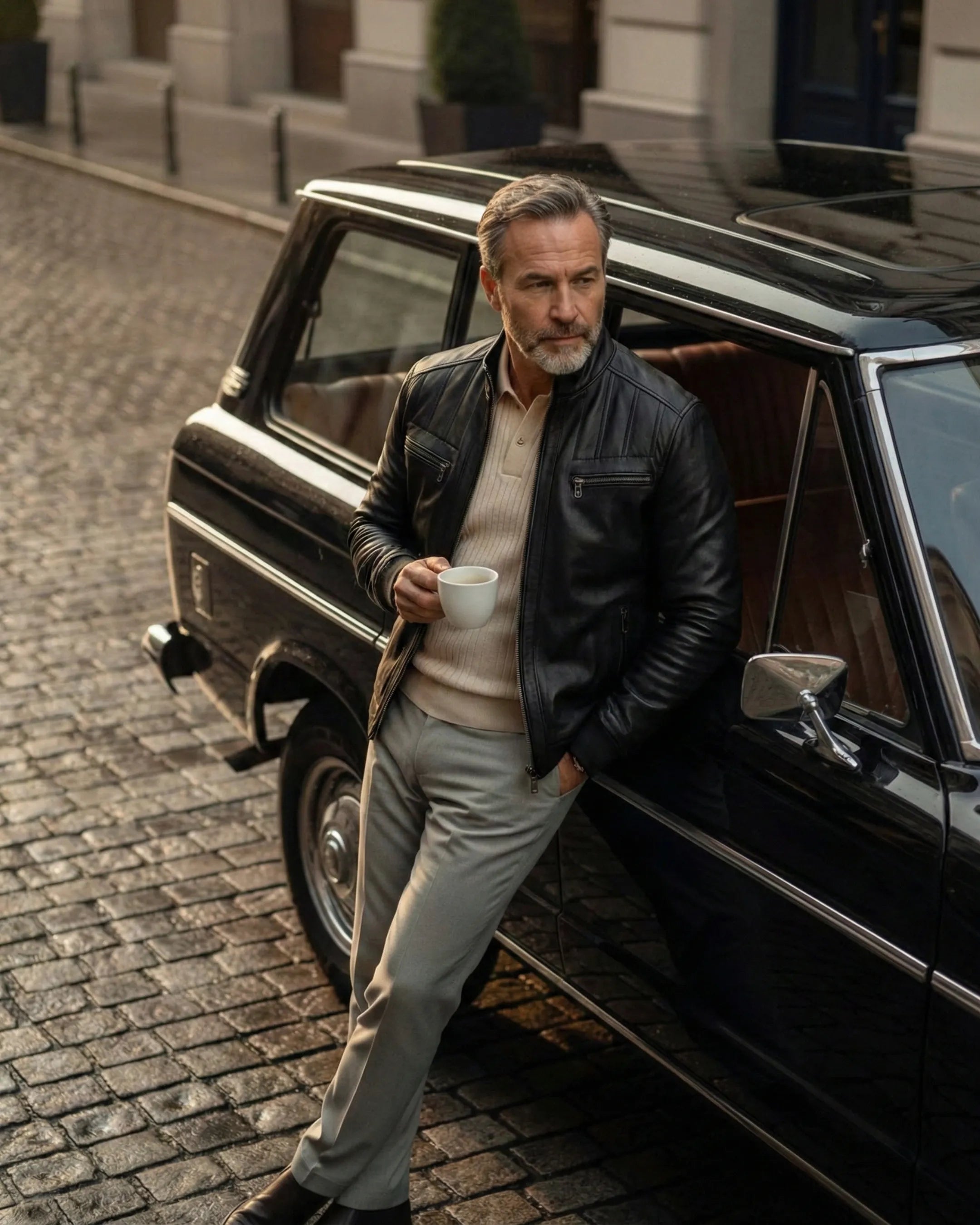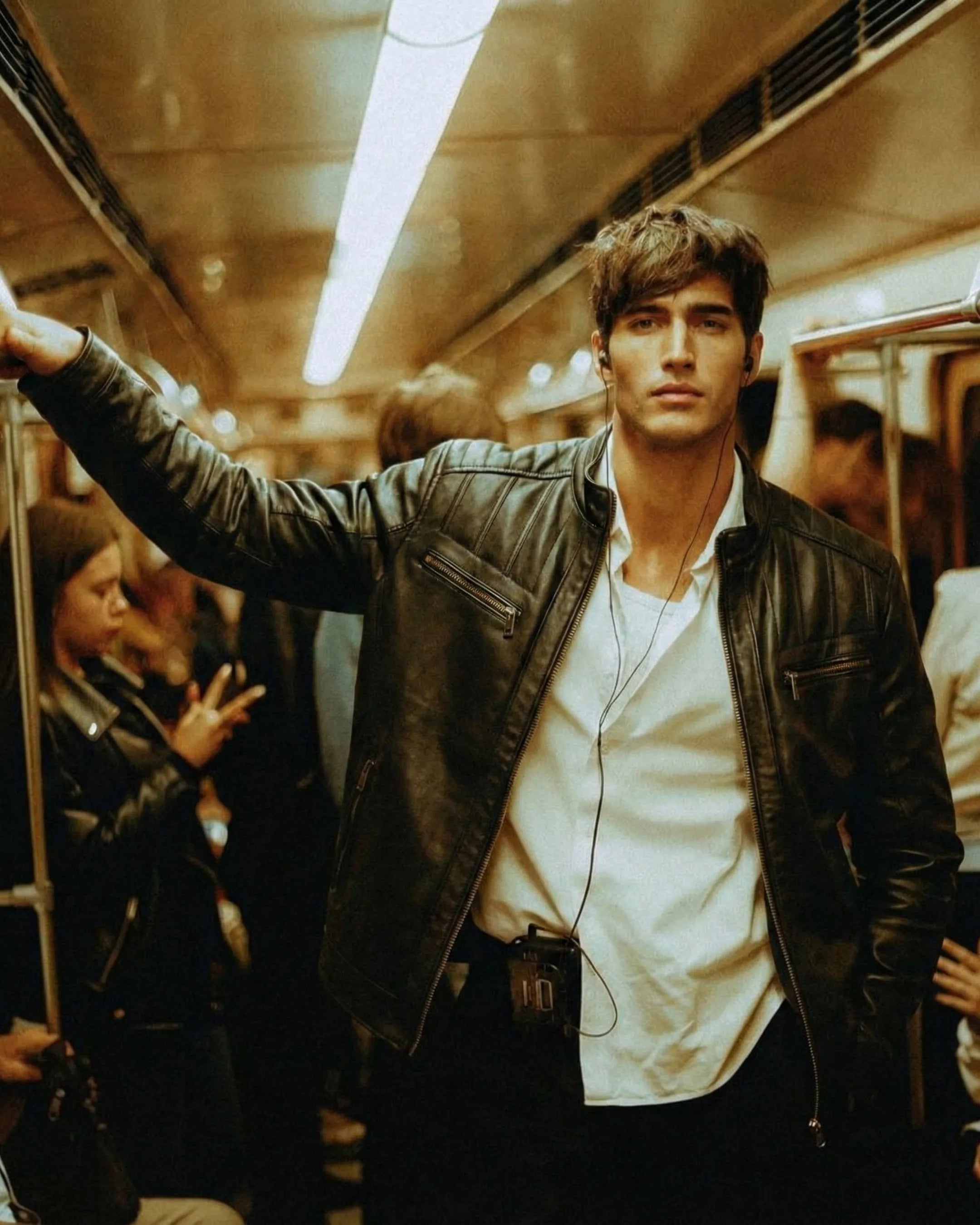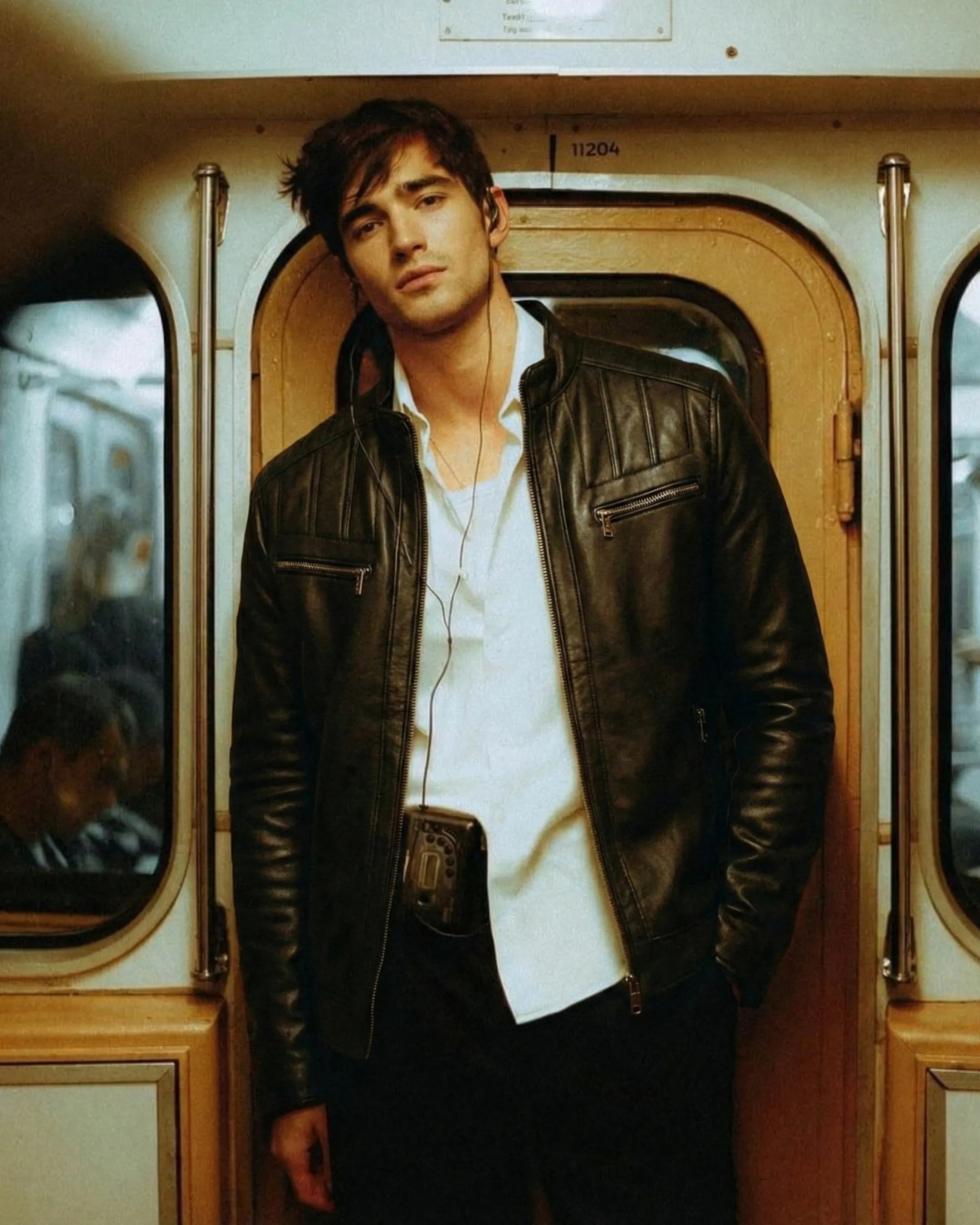 A leather jacket should sit clean on the shoulders, hug the chest lightly, and allow comfortable movement. Sleeves should reach the wrist bone. If you plan to layer a knit, consider one size up.