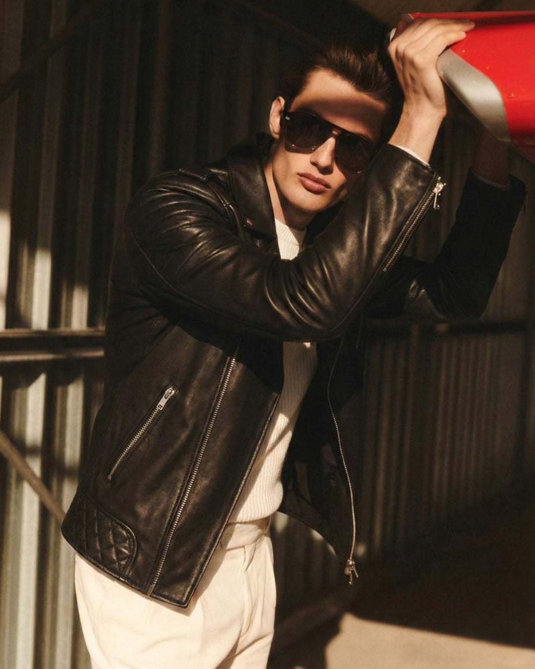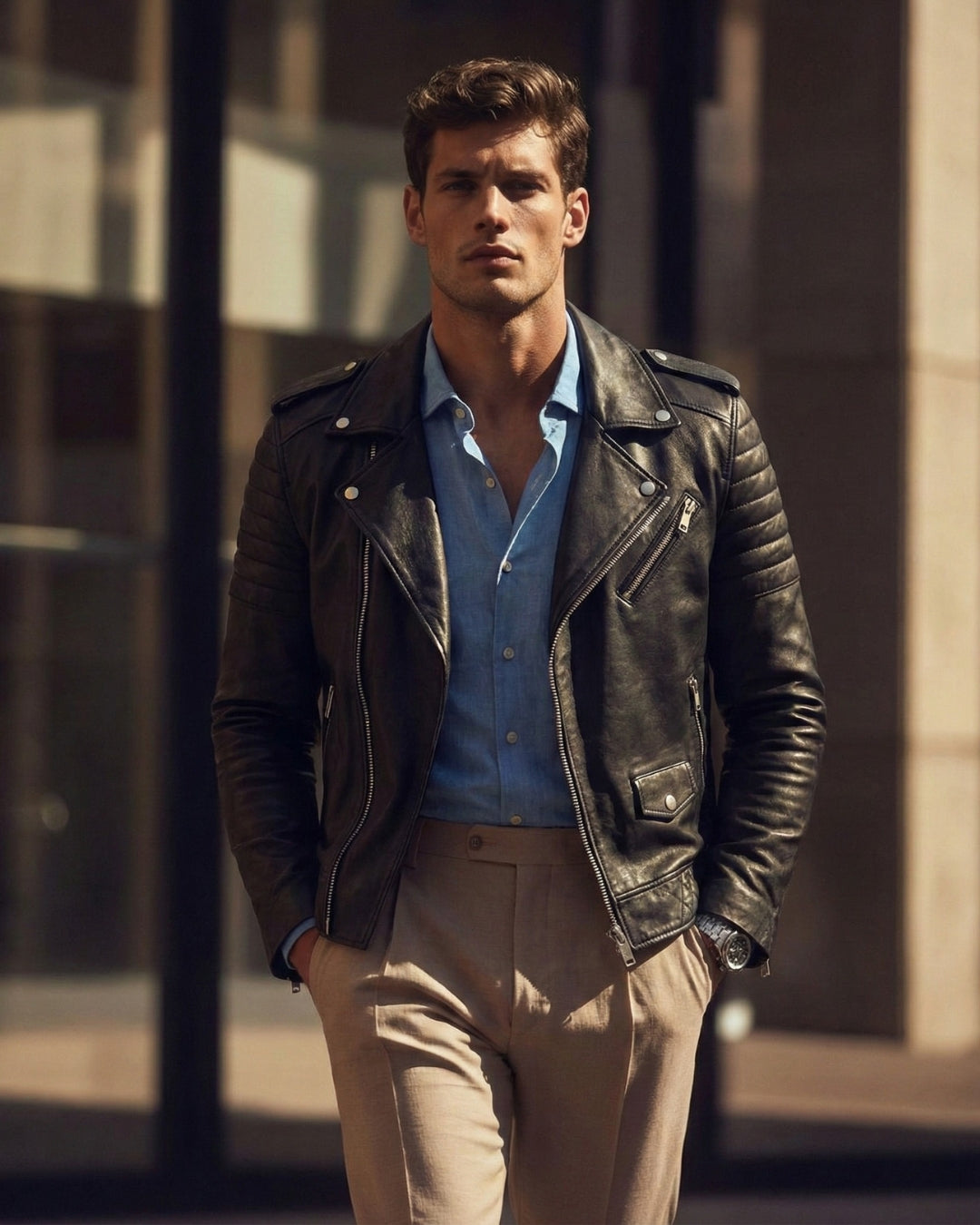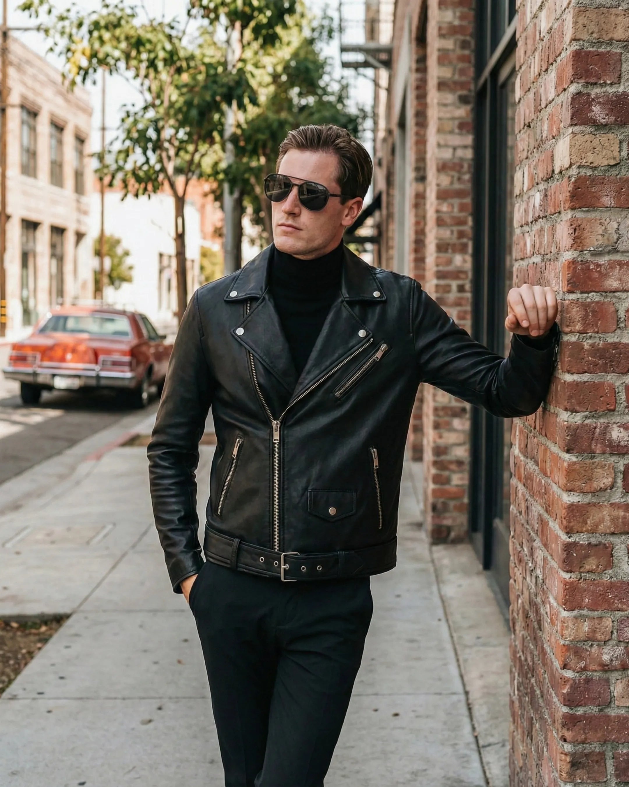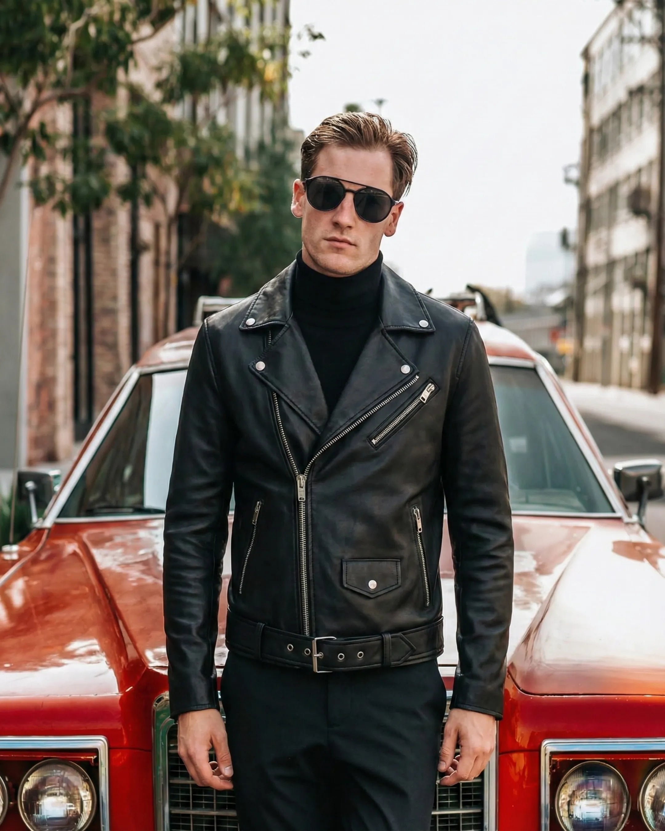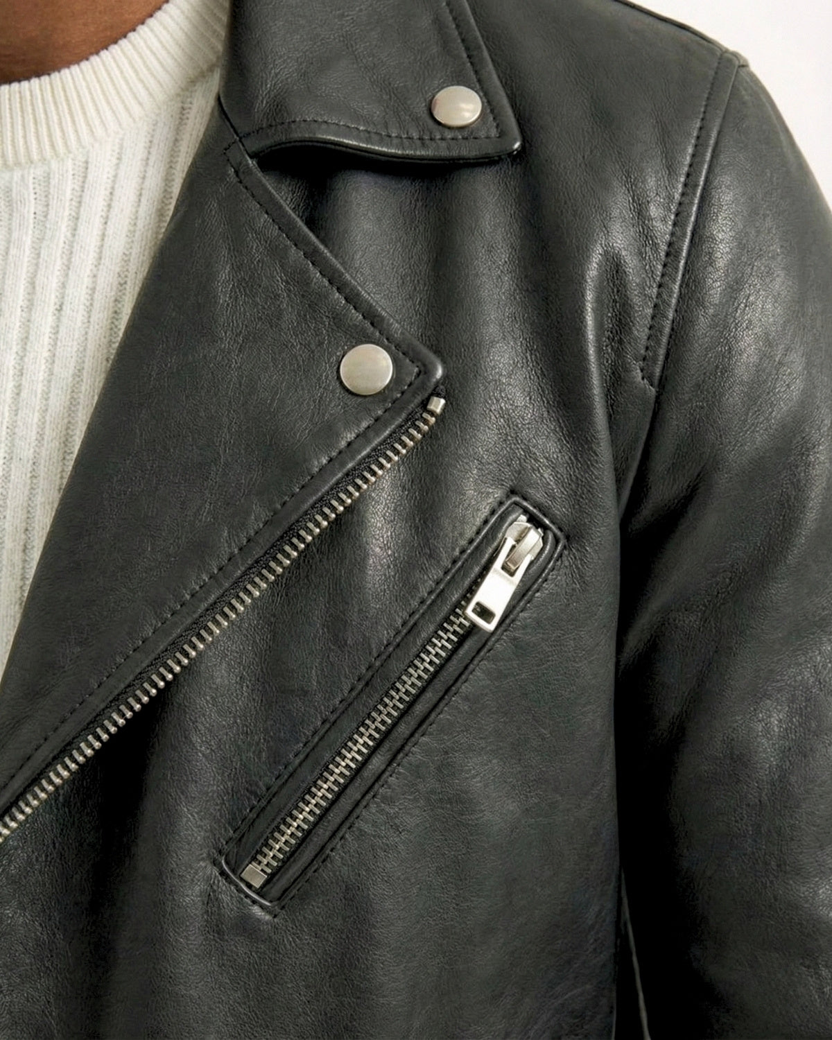 A leather jacket should sit clean on the shoulders, hug the chest lightly, and allow comfortable movement. Sleeves should reach the wrist bone. If you plan to layer a knit, consider one size up.