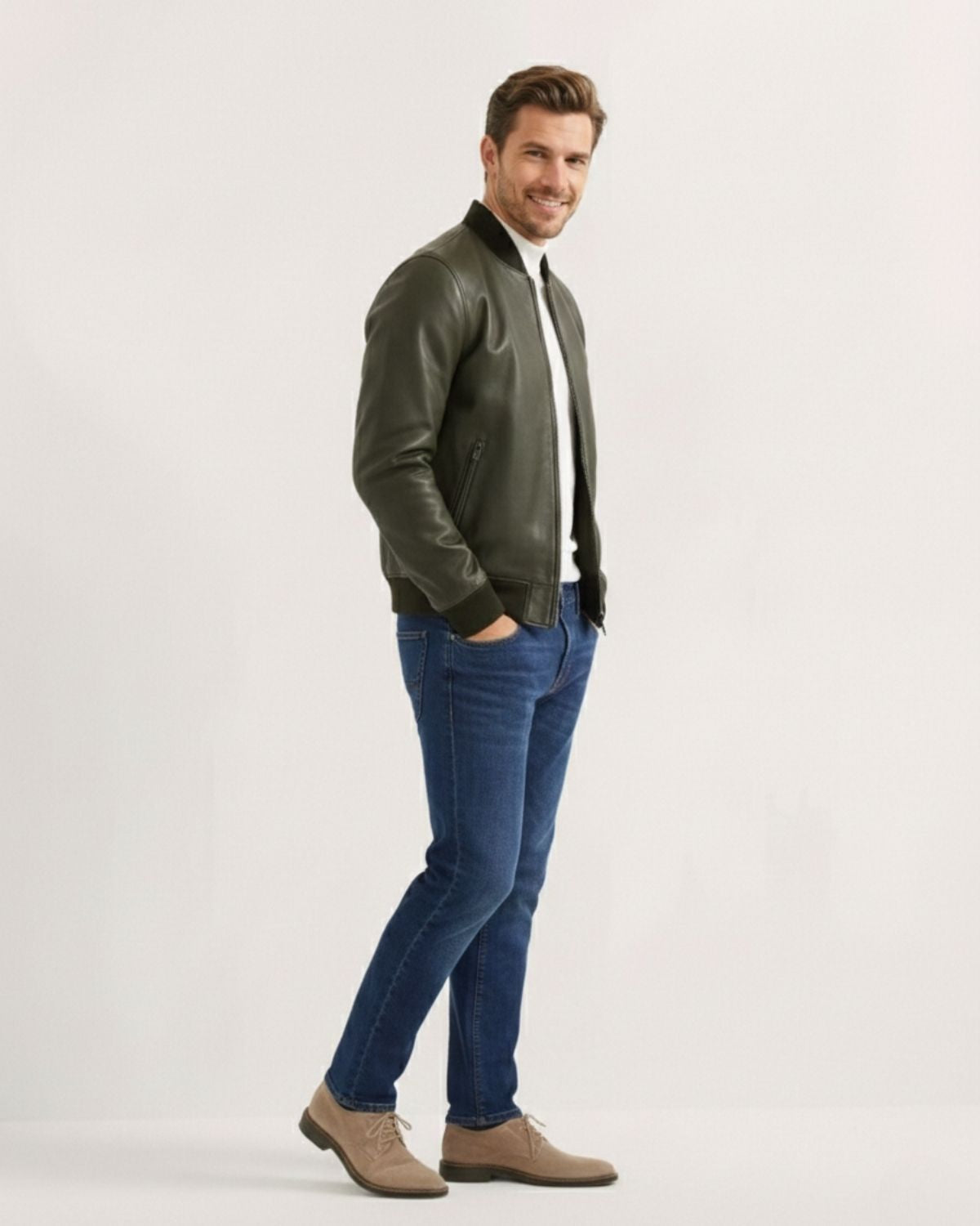 A leather jacket should sit clean on the shoulders, hug the chest lightly, and allow comfortable movement. Sleeves should reach the wrist bone. If you plan to layer a knit, consider one size up.