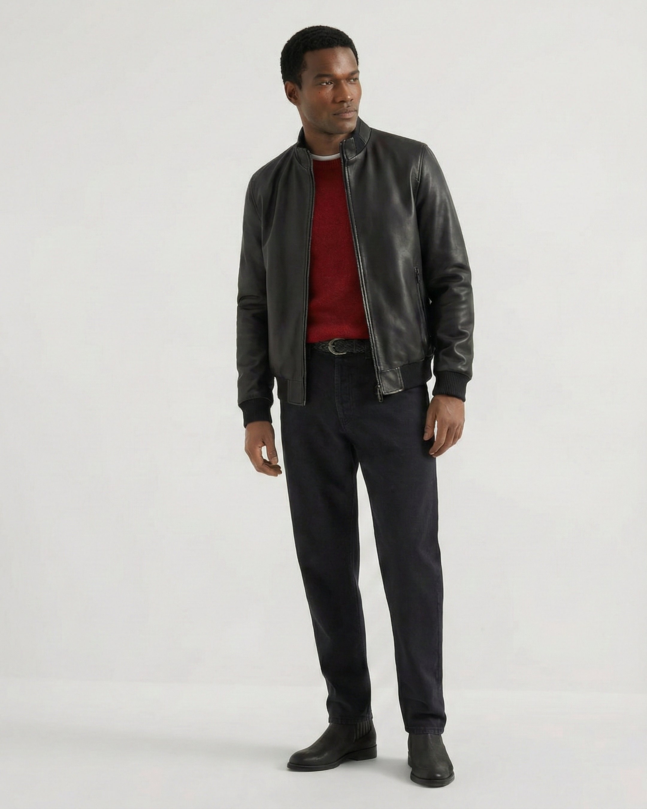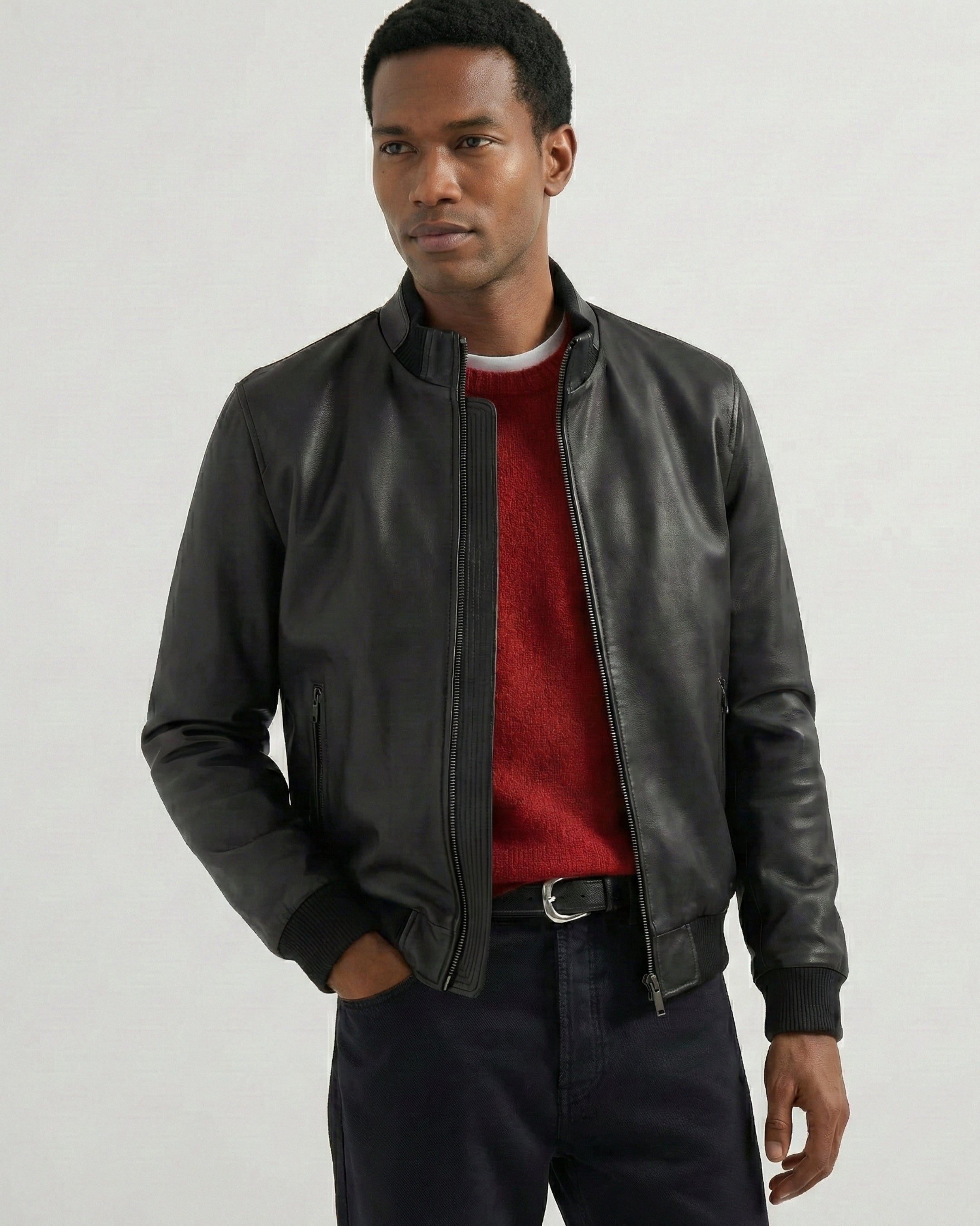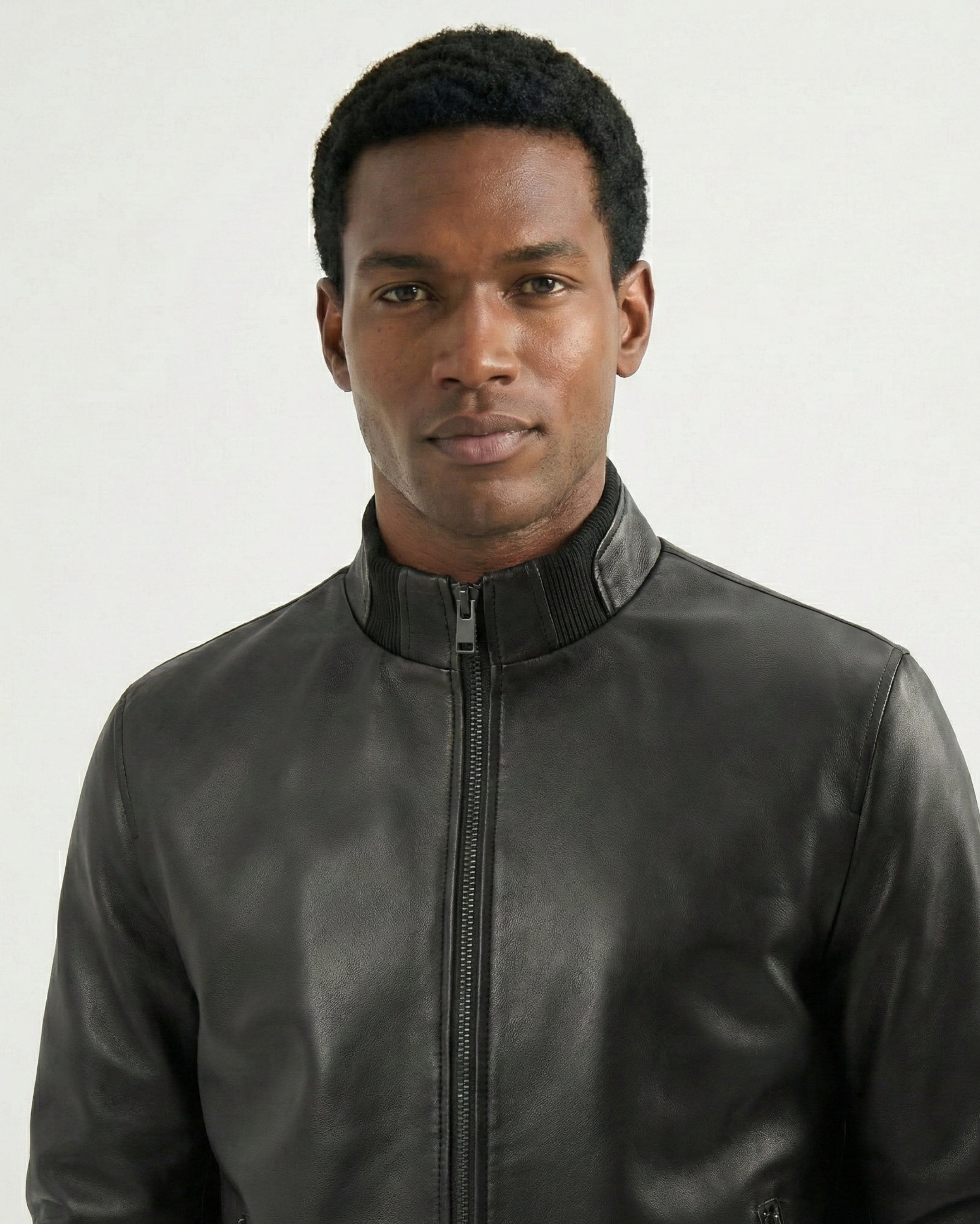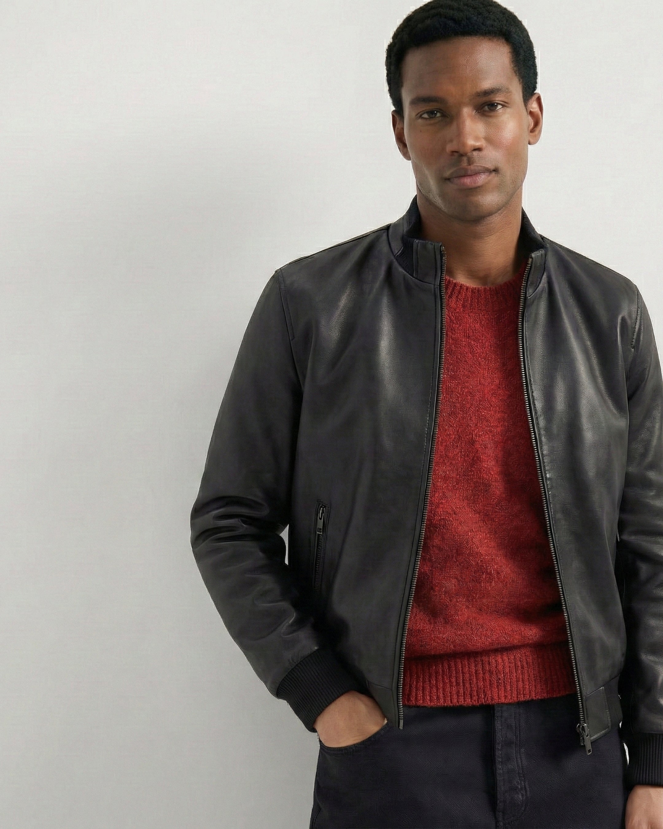 A leather jacket should sit clean on the shoulders, hug the chest lightly, and allow comfortable movement. Sleeves should reach the wrist bone. If you plan to layer a knit, consider one size up.